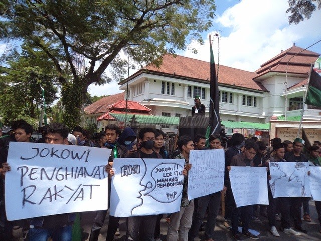 Selain itu massa aksi HMI menganggap Jokowi sebagai pembohong dan menyamakannya seperti “pinokio” karena membuat kebijakan-kebijakan yang tidak pro-rakyat dan bertentangan dengan janji-janjinya pada waktu kampanye. Mereka juga mengecam cara kerja Jokowi yang blusukan, seperti yang dikatakan Husein salah satu Korlap aksi.