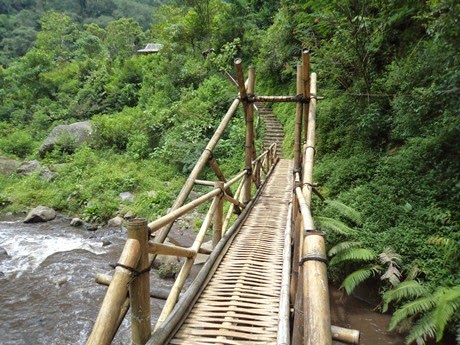 Selama perjalana, pengunjung juga akan melewati jembatan yang terbuat dari bambu yang di bawahnya mengalir air dari air terjun Coban Pelangi. Setelah sekitar kurang lebih 1 km berjalan kaki dari pintu masuk, tidak jauh dari jembatan bambu tersebut, sampailah kita pada lokasi Air Terjun yang selama perjalanan hanya bisa kita dengar suaranya, sekarang kita dapat langsung menikmati keindahan dan segarnya Air Terjun Coban Pelangi.
