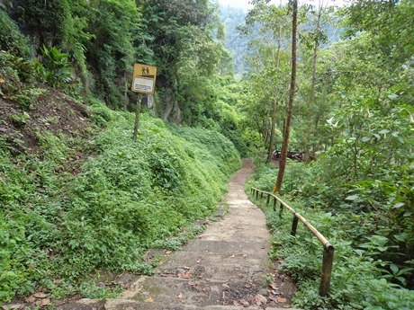 Setelah membeli karcis, baru kita bisa melanjutkan perjalanan menuju lokasi air terjun yang memiliki ketinggian 107 m tersebut dengan berjalan kaki. Di sepanjang perjalanan menuju lokasi air terjun, lagi-lagi kita disuguhi pemandangan yang sangat indah, pohon-pohon kokoh yang menjulang tinggi, bukit hijau, batuan tebing, ditambah lagi dengan suara gesekan daun dan suara air terjun yang semakin lama semakin terdengar jelas, menambah rasa kagum dan rasa syukur kita kepada Tuhan yang telah menciptakan semua ini.
