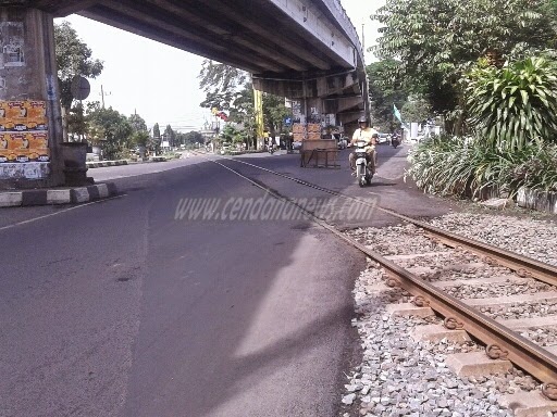| Pengendara melintasi rel kereta api di bawah jembatan layang Arjosari |