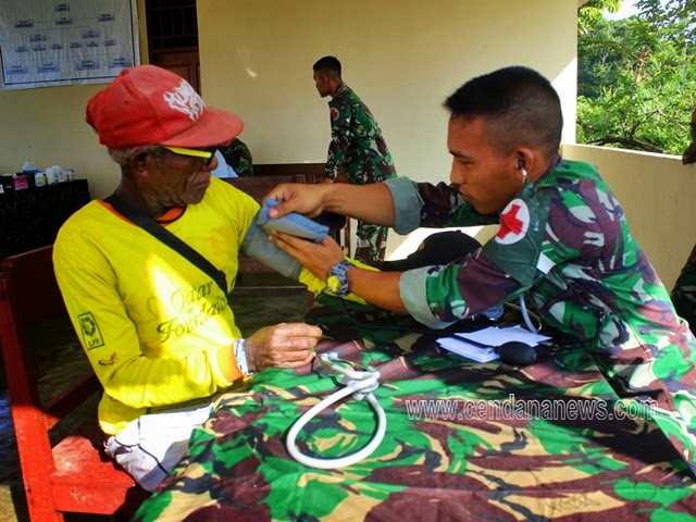 | Salah satu pasien saat diperiksa petugas medis dari Yonif 133 YS |