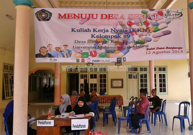 MALANG — Dalam rangka Kuliah Kerja Nyata, kelompok mahasiswa KKN 89 Universitas Muhammadiyah Malang (UMM) mengadakan pengobatan gratis kepada masyarakat tidak mampu di Desa Banjarejo Kecamatan Pagelaran Kabupaten Malang. Pengobatan gratis ini di adakan di Kantor Kepala Desa Banjarejo, yang berada di jalan KH. Hasyim Asyari No.1.