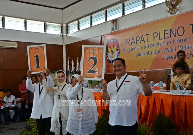 | Pasangan Pilwali memperlihatkan nomor urut hasil pengundian |