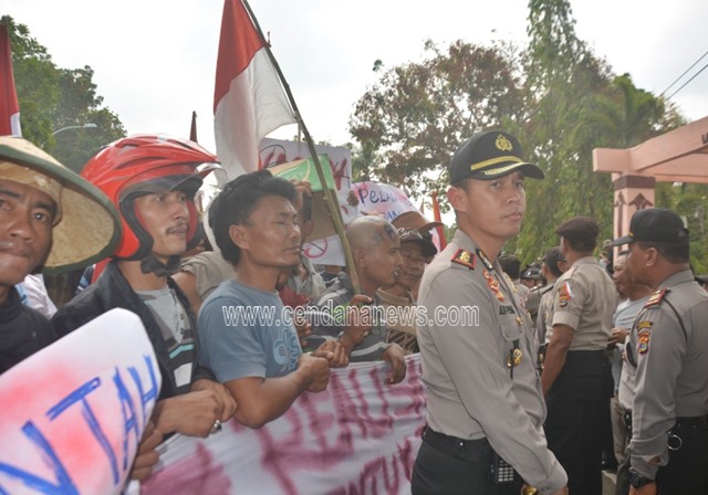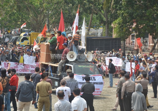 Ribuan massa berdatangan menggunakan sebanyak 60 kendaraan yang dikawal oleh Polres Lampung Selatan dari desa mereka ke kantor DPRD Lamsel