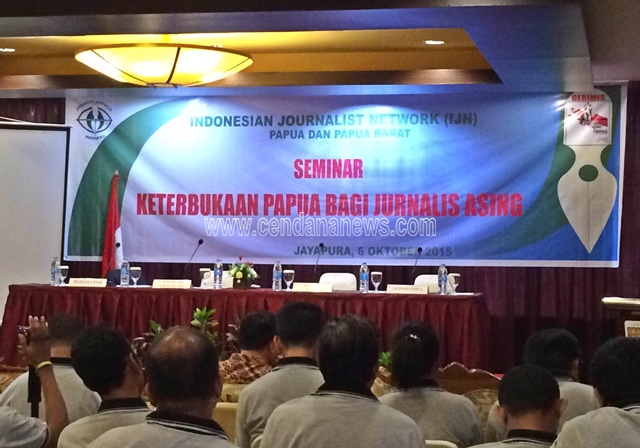 JAYAPURA — Pengurus Jaringan Jurnalis Indonesia (JJI) atau Indonesian Journalits Network (IJN) provinsi Papua dan Papua Barat, hari ini resmi dikukuhkan di Kota Jayapura oleh Ketua Umum JJI, Yaya Suryadarma, Selasa (06/10/2015) yang dikemas dalam kegiatan seminar Keterbukaan Papua bagi Jurnalis Asing.