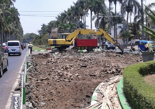 MALANG — Keinginan Pemkot Malang untuk merenovasi mengembalikan wajah Jalan Ijen ke tempo dulu nampaknya akan segera terwujud. Hal ini dapat terlihat dari mulai dilakukannya pembongkaran aspal di ruang kosong yang berada di sebelah kanan kiri tugu teratai menggunakan alat berat.