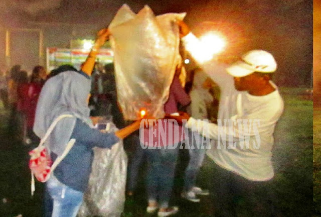 | Masyarakat yang berjuang menyalahkan dan menrbangkan lampion ke udara saat perayaan malam tahun baru di Gelora Samador Maumere. |