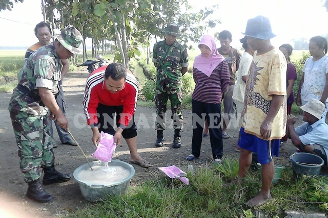 Petugas Penyuluh Lapangan (PPL) bersama Babinsa dan warga bergotong royong menyemprotkan racun pembasmi hama wereng sebelum meluas.