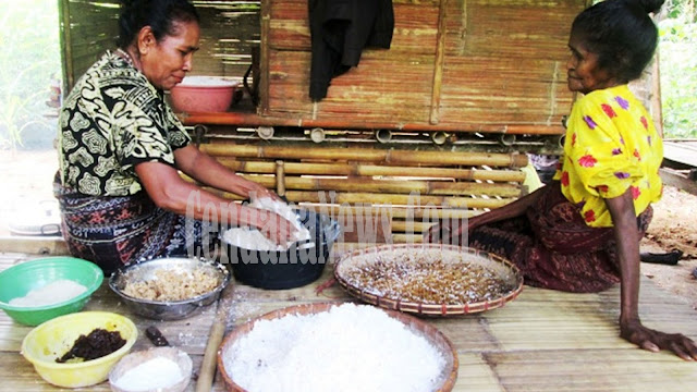 | Perempuan etns Tana Tai sedang menumbuk beras di Nuhun (Lesung) memakai Alu untuk membuat Lekun. |