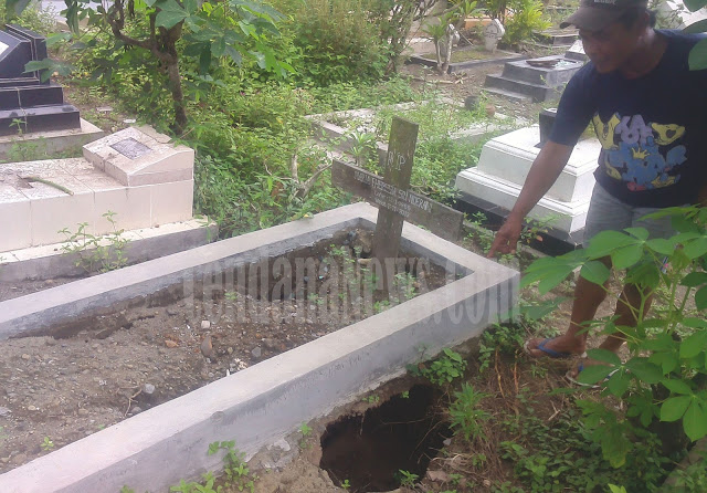 | Lilik Kuswadi menunjukkan makam yang longsor |