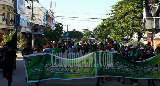 KENDARI—Himpunan Mahasiswa Islam (HMI) Cabang Kendari menggelar jalan sehat sebagai rangkaian memperingati hari ulang tahun (milad) yang ke-69. Ratusan kader dan alumni HMI Kendari, mengikuti jalan sehat yang mengambil star di sekretariat HMI Cabang Kendari yang terletak di Gang Lafran Pane, Minggu (14/2/2016).