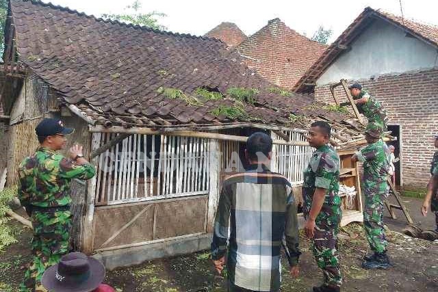 PROBOLINGGO — Akibat angin puting beliung yang terjadi pada hari Rabu (3/2/2016) dini hari, beberapa rumah rusak parah di dua desa yakni Desa Blado Kulon dan Desa Bulu Jaran, Kecamatan Tegal Siwalan, Kabupaten Probolinggo, Jawa Timur. Melihat permasalahan tersebut personel Komando Distrik Militer (Kodim) 0820/Probolinggo bersama warga membangun kembali rumah-rumah mereka.