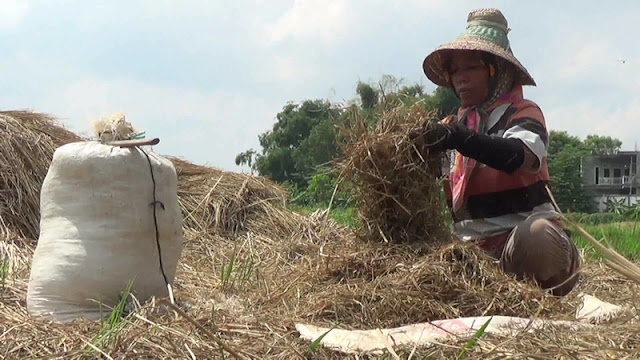 “Ya sebenarnya susah, apalagi tumpukan jerami itu sudah terkena hujan, karena ketika basah sangat sulit memisahkan gabah dengan jerami, butuh kesabaran agar bisa pulang membawa gabah,” jelasnya.