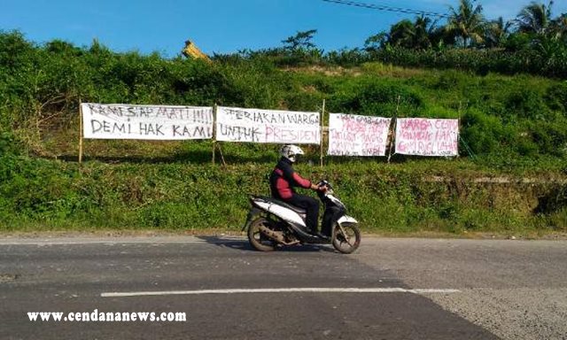 LAMPUNG — Puluhan warga terdampak pembangunan Jalan Tol Trans Sumatera (JTTS) ruas Bakauheni – Terbanggi Besar dusun Cilamaya Desa Bakauheni Kecamatan Bakauheni Kabupaten Lampung Selatan memasang spanduk protes di tepi Jalan Lintas Sumatera. Spanduk dengan berbagai tulisan cat merah tersebut diantaranya; proses hukum dan usut tuntas oknum-oknum terkait, warga cilamaya menuntut hak ganti rugi lahan.