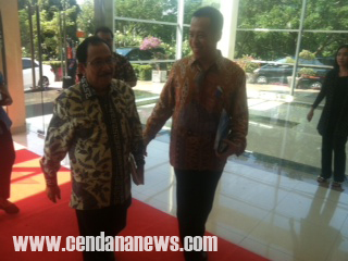 | Rektor UMB Arissetyanto Nugroho (kanan) menyambut kedatangan Tanri Abeng (kiri) |