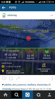 Kepala Badan Metereologi, Klimatologi dan Geofisika (BMKG) Wilayah III Denpasar, I Wayan Suardana menjelaskan, gempa yang terjadi pukul 12.13 WITA itu berlokasi di 11.42 LS, 116.24 BT. “286 kilometer barat daya Sumbawa Barat NTB dengan kedalaman 10 kilometer. Kekuatan gempa 6,2 SR dan tidak menimbulkan tsunami,” kata Suardana saat dihubungi, Kamis (9/6).