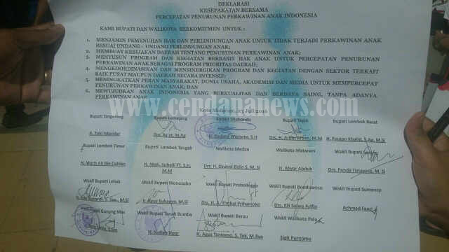 MATARAM — Belasan Bupati dan Walikota dari seluruh daerah di Indonesia, khususnya yang angka perkawinan anak usia dini di daerahnya masih tinggi menandatangani deklarasi kesepakatan bersama percepatan penurunan perkawinan anak di Indonesia.