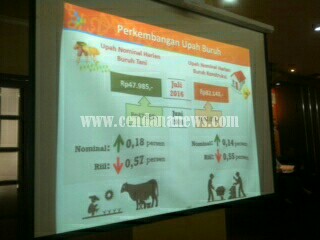 “Perkembangan rata-rata upah pekerja atau buruh tani secara nasional bulan Juli 2016 meningkat sebesar 0,18 % jika dibandingkan dengan upah pekerja atau buruh tani pada bulan Juni 2016, yaitu dari Rp. 47.898 menjadi Rp. 47.985 per hari, sedangkan upah nominal buruh bangunan atau tukang yang bukan mandor pada bulan Juli 2016 meningkat sebesar 0,14 % jika dibandingkan dengan bulan Juni 2016, yaitu dari Rp. 82.028 menjadi Rp. 82.143 per hari, sedangkan upah riil nya menurun sebesar 0,55 %” demikian kata Drs. Suryamin, Kepala BPS Pusat, Senin siang (15/8/2016).