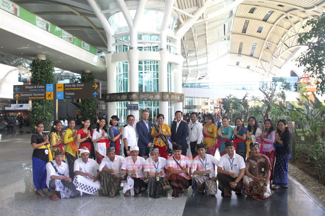 Dengan berbalut pakaian adat Bali, rombongan manajemen Bandara Internasional I Gusti Ngurah Rai menyapa para customer, baik yang berada di terminal internasional maupun terminal domestik.