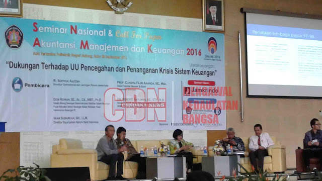 MALANG — Salah satu bentuk dukungan terhadap program pemerintah untuk mensosialisasikan Undang-Undang Pencegahan dan Penanganan Krisis Sistem Keuangan (UU PPKSK) kepada berbagai pihak terutama praktisi dan akademisi, jurusan Akuntansi Politeknik Negeri Malang (Polinema) mengadakan sebuah seminar nasional bertajuk ‘Literasi Keuangan : Dukungan Terhadap UU PPKSK’, Rabu (27/9/2016).