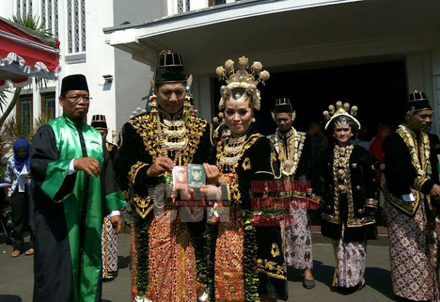 YOGYAKARTA — Sebanyak 7 pasangan pria dan wanita dari berbagai daerah di DI Yogyakarta, melangsungkan pernikahan bersama di halaman depan Stasiun Kereta Api Jogjakarta (Stasiun Tugu), Selasa (6/9/2016). Sebelum melangsungkan akad nikah, ketujuh pasangan dikirab dari kawasan Malioboro Kota Yogyakarta menuju Stasiun Tugu, diiring bregodo tradisonal Jogoboro.