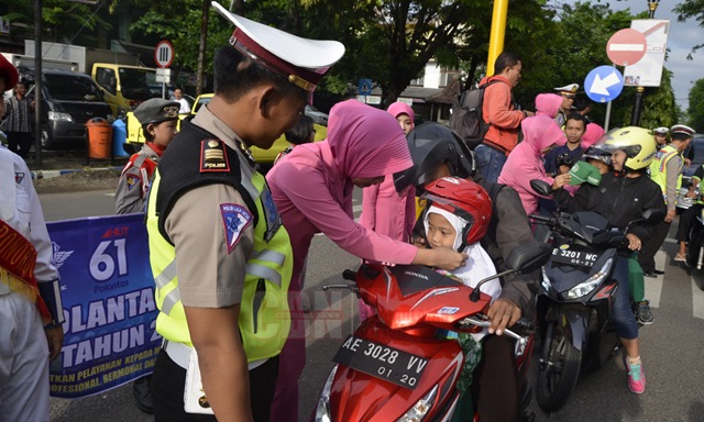 PONOROGO — Dalam rangka memperingati hari jadi ke-61 tahun Polisi Lalu Lintas (Polantas), Kepala Satuan Lalu Lintas (Kasatlantas) Kepolisian Resor (Polres) Ponorogo, AKP Imam Mustolih bersama belasan anggota lainnya membagikan 61 helm secara gratis kepada anak-anak yang diajak berkendara motor oleh orang tuanya.