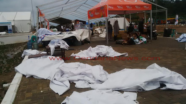 “Stand SMAN 1 Kabupaten Kayong Utara, sekolah rujukan. Kejadian jam 07. 00 WIB. Tenda habis. 15 meter tebawa angin atapnya. Karena di bawahnya gak ada pasak. Piala rusak, patah. Gak bisa digunakan lagi,” kata Nurlela, guru SMAN 1 Kayong Utara, di lokasi kejadian, Jumat, 14 Oktober 2016.