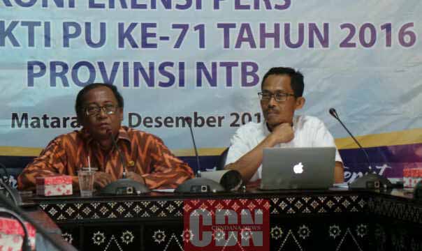 | Sekretaris Dinas PU NTB, Ahmad Mahul,kanan saat menggelar konferensi pers bersama Kepala Dinas PU, kiri dalam rangka bulan bhakti PU NTBke 71 |