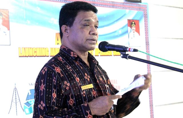 | Kepala Dinas Perhubungan, Komunikasi dan Informatika kabupaten Sikka Wihelmus Sirylus Ssos. Msi sedang menerangkan tentang aplikasi Simda yang diluncurkan |