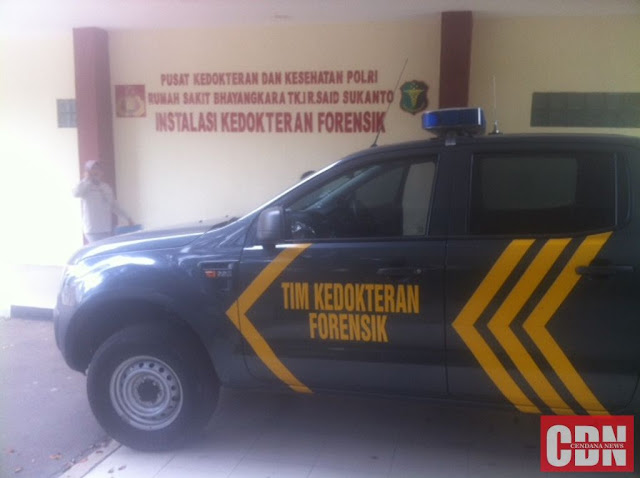 | Mobil Tim Kedokteran Forensik baru saja tiba di RS. Polri Sukanto, Kramat Jati, Jakarta Timur. |