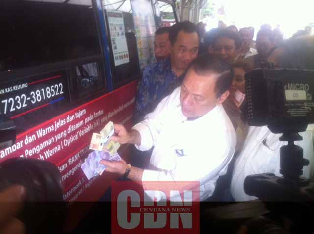 Gubernur BI Agus Dermawan Wintarto Martowardojo sedang memperlihatkan mata uang baru pecahan Rupiah di Blok M Square