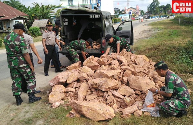 | Para personel TNI dan Polri bekerja bakti memperbaiki jalan berlubang. |
