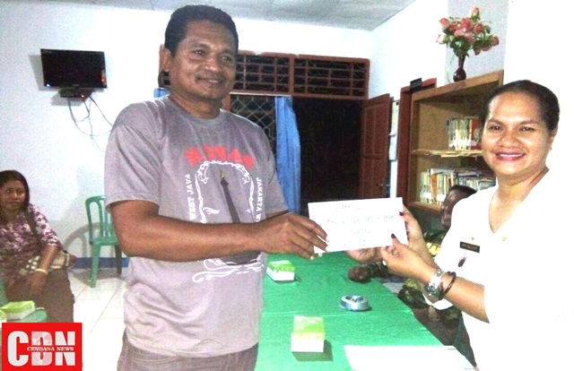 | Lurah Nangalimang, Maria Getrudis Alestri S.Tiwa, S.STP (kanan) saat memberikan hadiah kepada pemenang lomba kebersihan. |