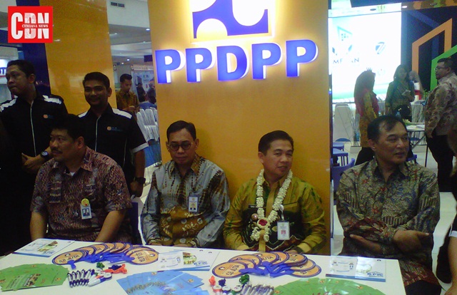 | Direktur Utama PT PPDPP, Budi Hartono (dua dari kiri) dan Wali Kota Banjarmasin, Ibnu Sina (dua dari kanan) saat konferensi pers di lokasi pameran rumah murah. |