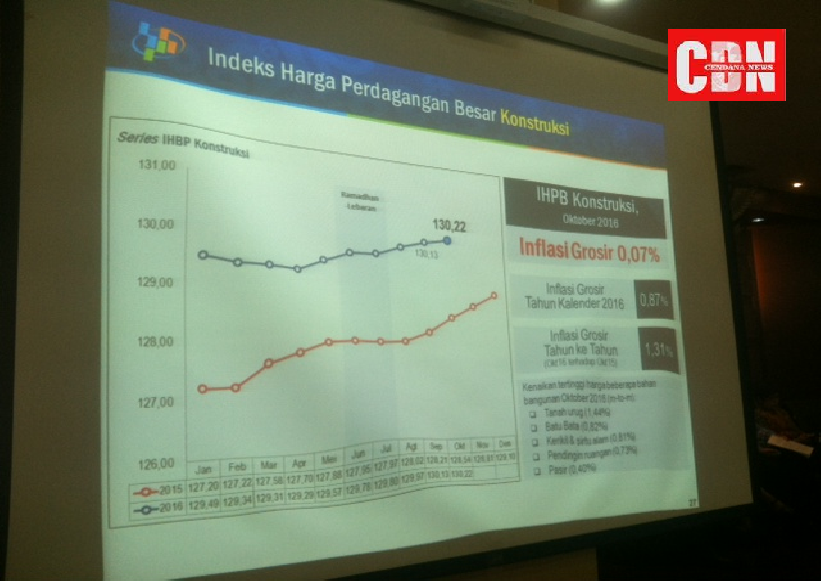 “IHPB Bahan Bangunan atau Konstruksi sepanjang bulan Oktober 2016 tercatat mengalami kenaikan sebesar 0,07 % terhadap bulan sebelumnya antara lain disebabkan adanya kenaikan harga komoditas tanah urug sebesar 1,44 %, batu bata 0,82 %, kerikil dan sirtu alam 0,81 %, pendingin ruangan 0,73 % dan pasir 0,40 %, sedangkan IHPB Bahan Baku, Barang Konsumsi dan Barang Modal pada bulan September 2016 masing-masing mengalami kenaikan sebesar 0,31 %, 0,08 % dan 0,20 % dibandingkan bulan September 2016,” kata Suhariyanto saat jumpa pers, Selasa siang (1/12/2016) di Jakarta.