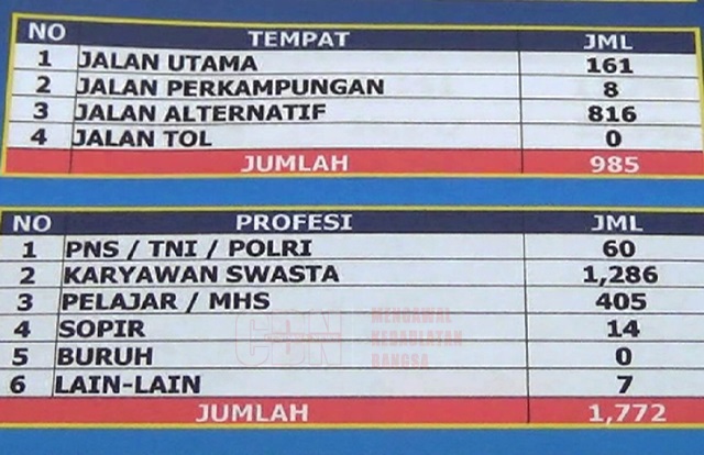 Selama setahun, terdapat 1.286 karyawan swasta yang terlibat kecelakaan lalu lintas, disusul pelajar/mahasiswa 405 orang, TNS/Polri-TNI 60 orang, Sopir 14 orang dan lain-lain tujuh orang.