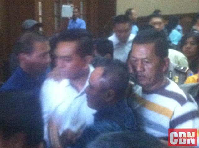 | M. Sanusi (kemeja putih) saat keluar meninggalkan ruangan persidangan. |