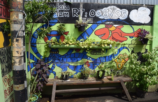 | Salah-satu dinding yang dilukis dan dijadikan media tanam. |