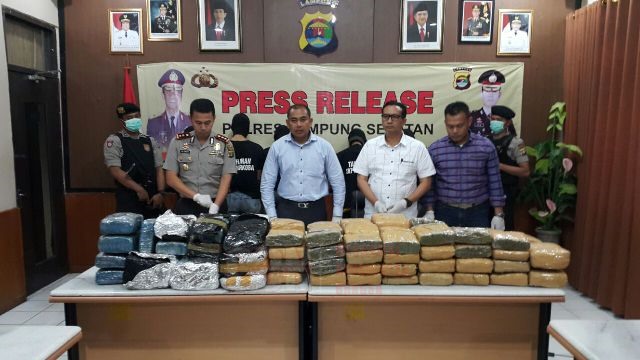 | Kapolres Lampung Selatan (paling kiri) AKBP Adi Ferdian Saputra dan pejabat Polres Lamsel dalam ekspos ganja |