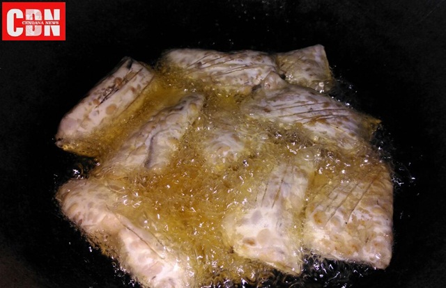 | Proses penggorengan tempe dengan bungkus daun. |