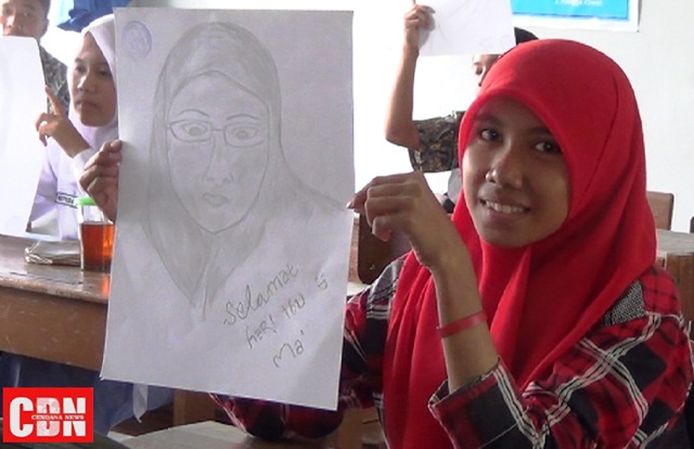 | Salah seorang siswa menunjukkan sketsa wajah ibu. |