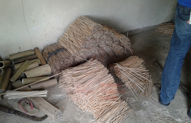 | Kateno saat membuat lidi dupa di rumahnya |