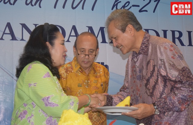| Potongan tumpeng pertama untuk Ketua Yayasan Damandiri, Subiakto Tjakrawerdaja. |