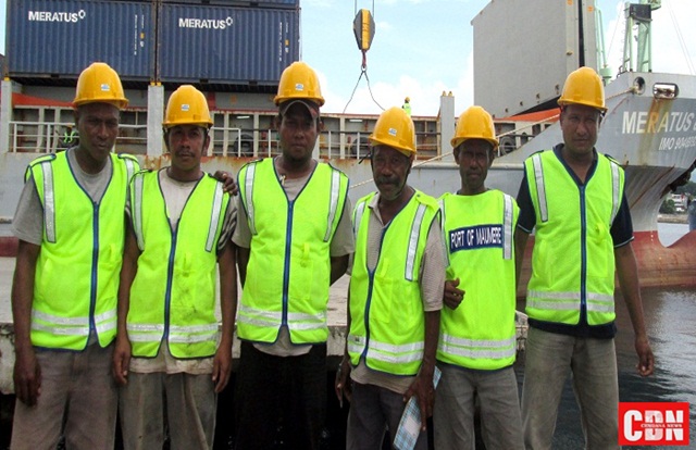 | Pekerja bongkar muat kelompok 6 di Pelabuhan Laurens Say Maumere. |