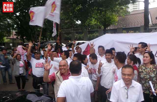 JAKARTA — Sandiago Uno datang mengunjungi Roemah Djoeang tepat pukul 17.17 WIB ketika real count terakhir masuk ke pusat data relawan Pasangan Calon (Paslon) 3, bahwa Agus-Sylvi mendapat 16.93%, Basuki-Djarot mendapat 41.43% dan Paslon 3 Gerindra Anies-Sandi mendapat 41.66% suara.