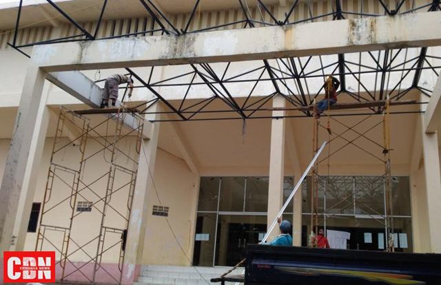 | Beberapa pekerja memperbaiki kanopi GOR Mustafa Kemal Kalianda. |