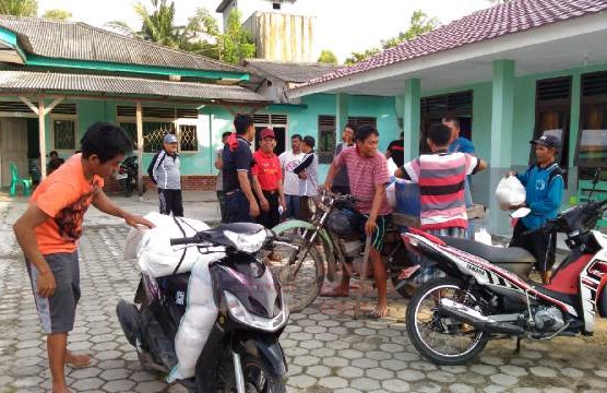 | Paket bantuan terpaksa diangkut menggunakan sepeda motor akibat akses jalan yang sulit. |