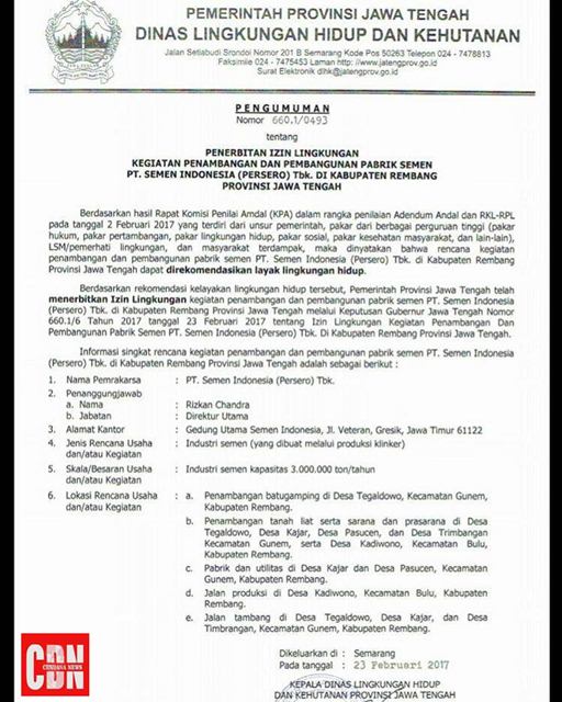 | SK Dinas Lingkungan Hidup dan Kehutanan Jateng tentang penerbitan izin lingkungan penambangan dan pembangunan pabrik semen. |