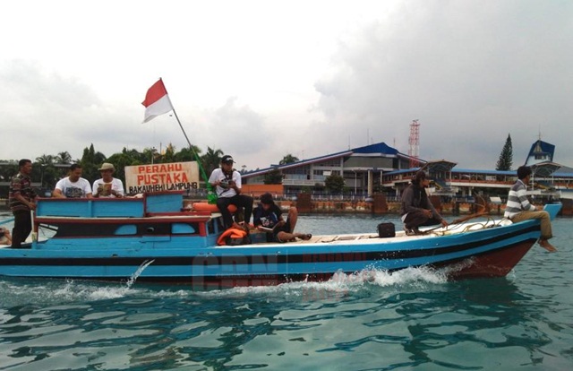 | Sejumlah jurnalis di Lampung saat hendak berangkat liputan menggunakan kapal. |