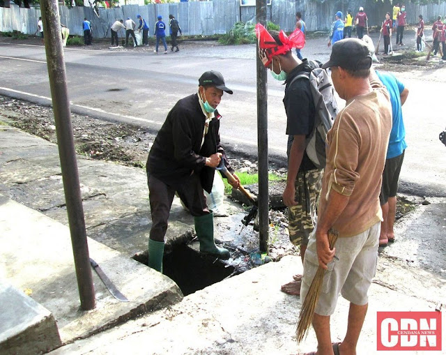 | Para wartawan sedang membersihkan saluran drainase di areal pertokoan Maumere. |